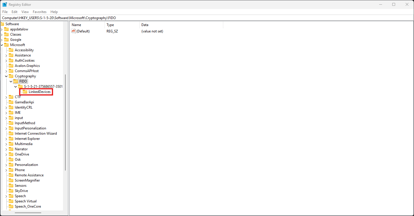 HKEY_USERS\S-1-5-20\Software\Microsoft\Cryptography\FIDO.Delete the Device Key under